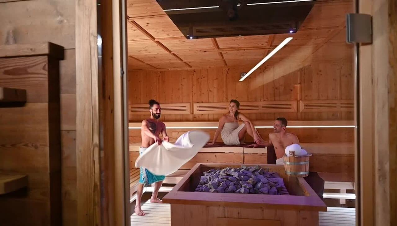 Our sauna area in Valdaora at Plan de Corones is a textile-free room and only accessible from the age of 14. For those in swimwear and for families with children, we offer a special textile sauna and a silent room outside the nude zone in the Aurora Acqua area.