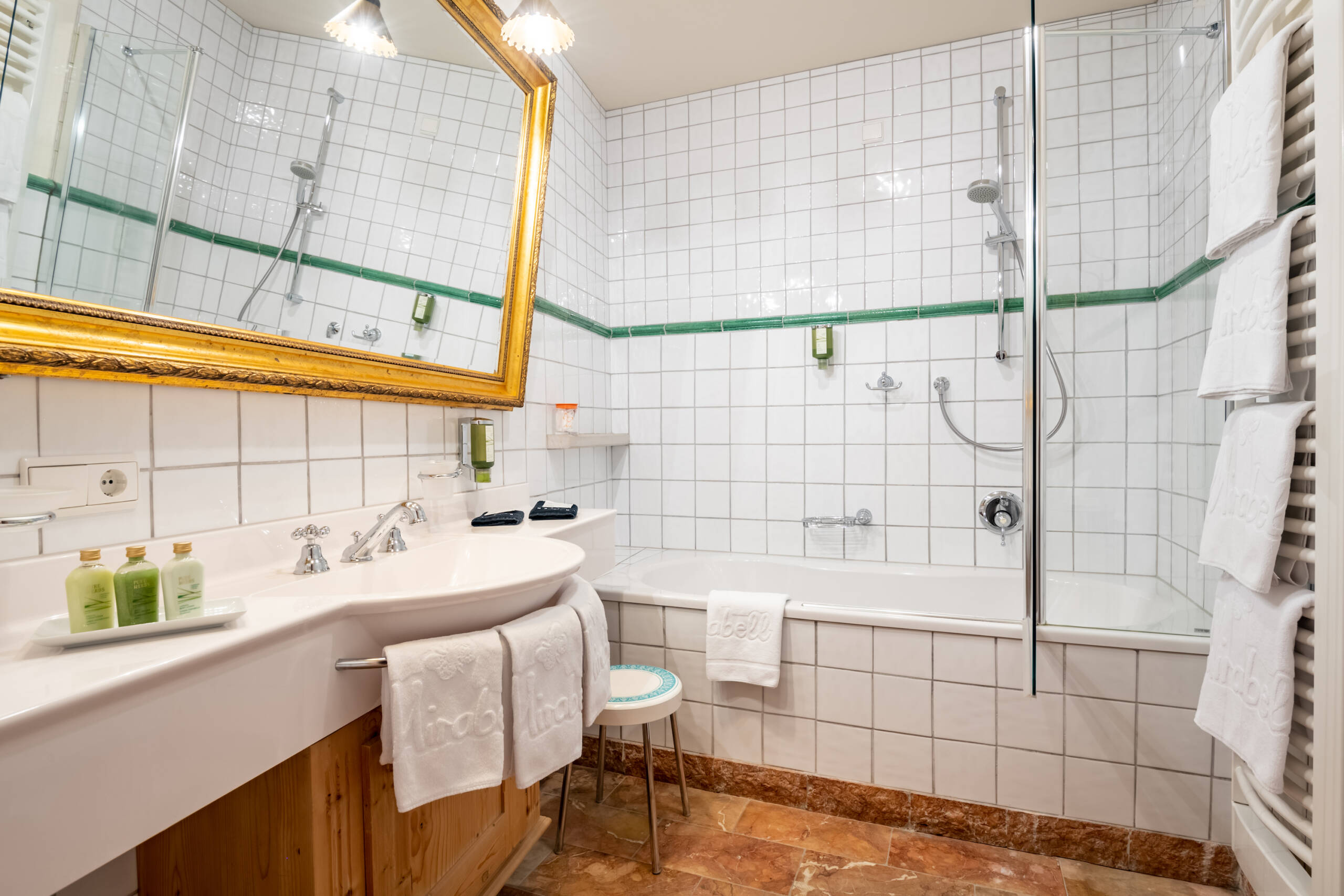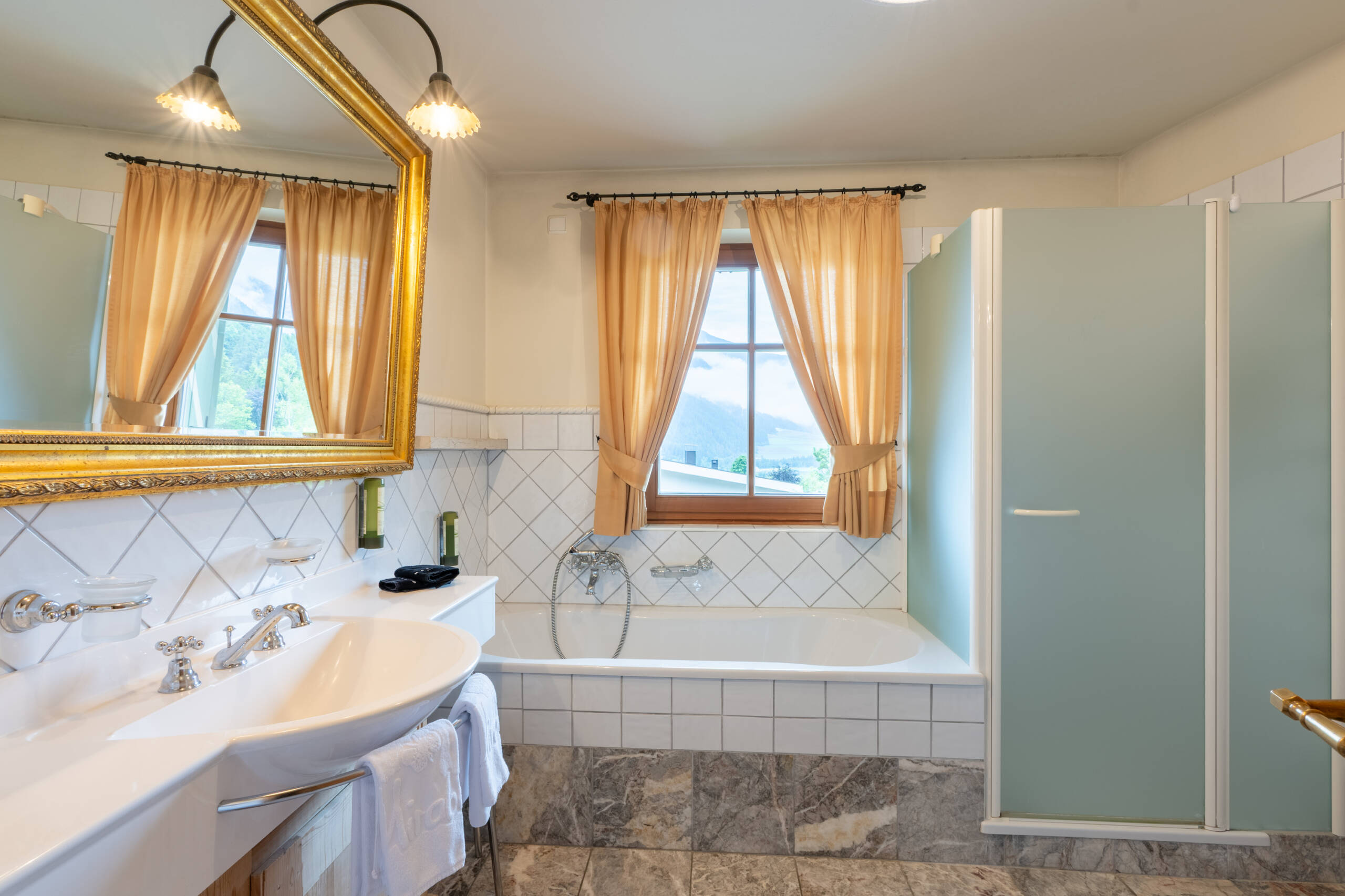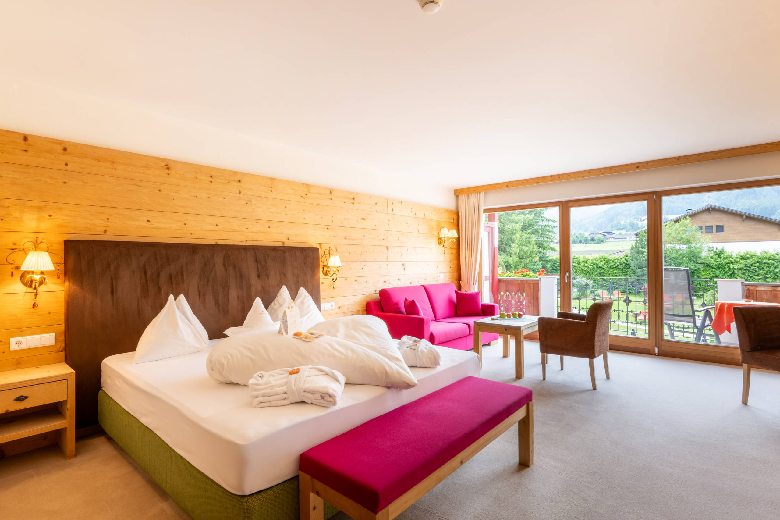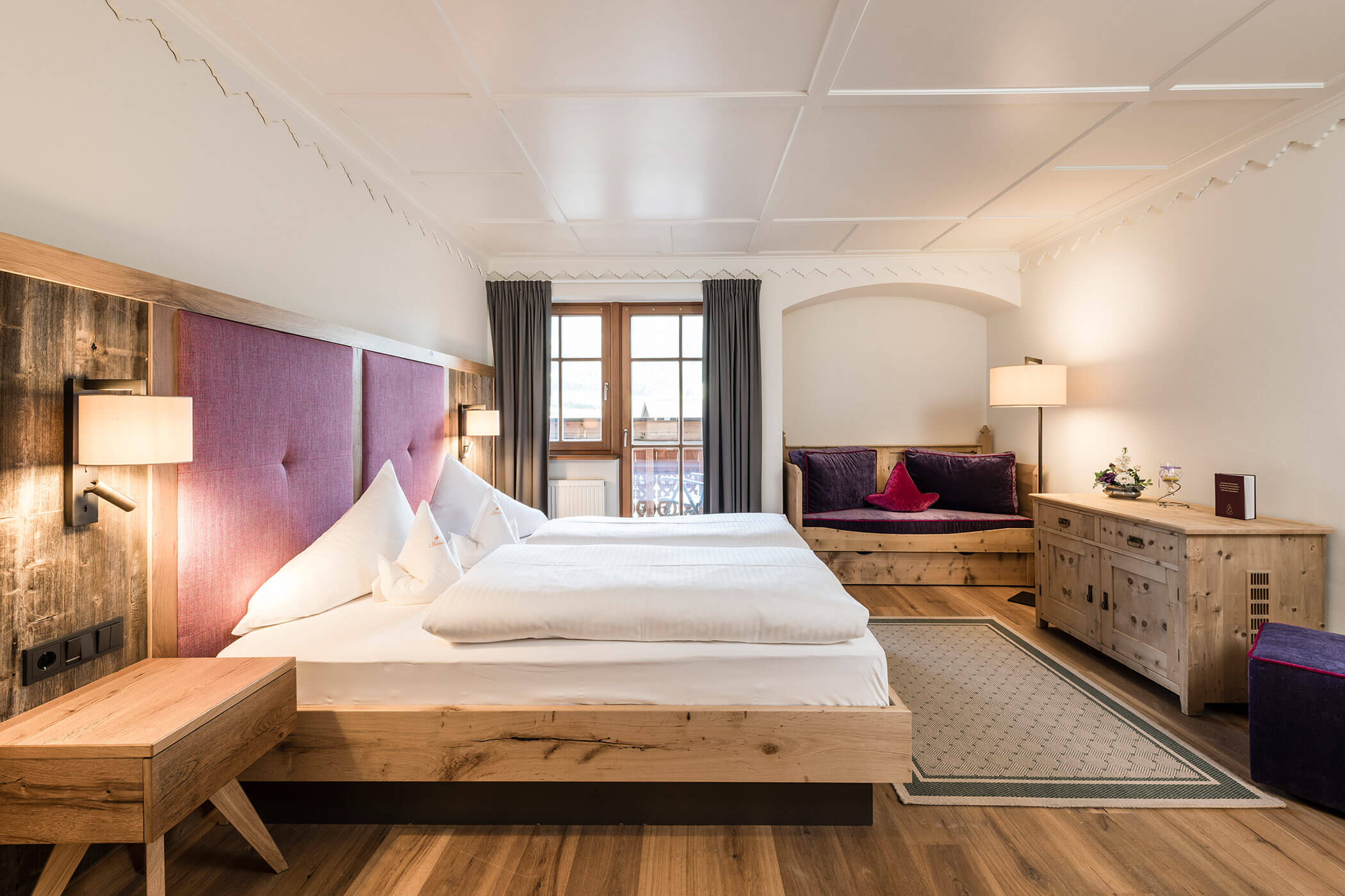 Dieses glanzvolle Zimmer ist einzigartig mit Altholz in Fichte – weiß geölt – und braunen Lodenstoffen eingerichtet, bietet ein Tageslichtbad mit Badewanne und Dusche, getrenntem WC mit Bidet, begehbarem Schrank, Wohnecke mit Kachelofen, Sat-LCD TV, Internetanschluss und Balkon zur Rieserferner Gruppe.
