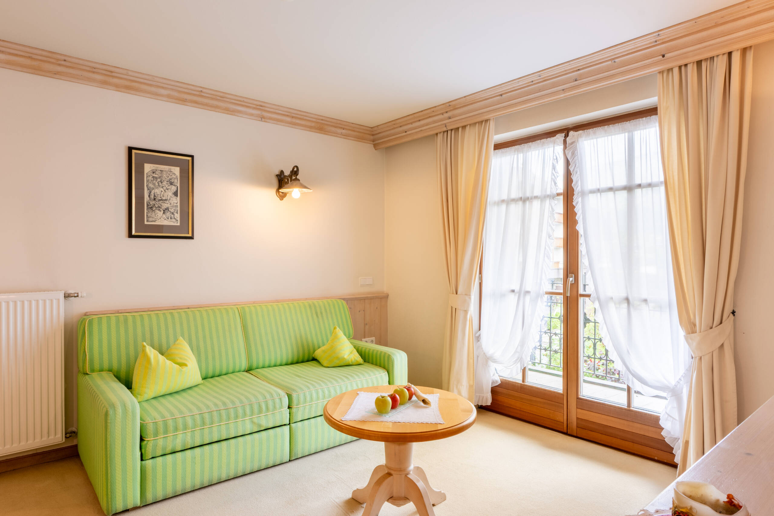 Unsere Zimmer zum Garten sind alle verschieden eingerichtet. Diese wunderbare Unterkunft ist mit hellem Zirbenholz, Bad mit Dusche und Badwanne, getrenntem WC und Bidet, Wohnecke, Sat-LCD TV, Internetanschluss und Südbalkon mit traumhaftem Garten- und Dolomitenblick bestückt.