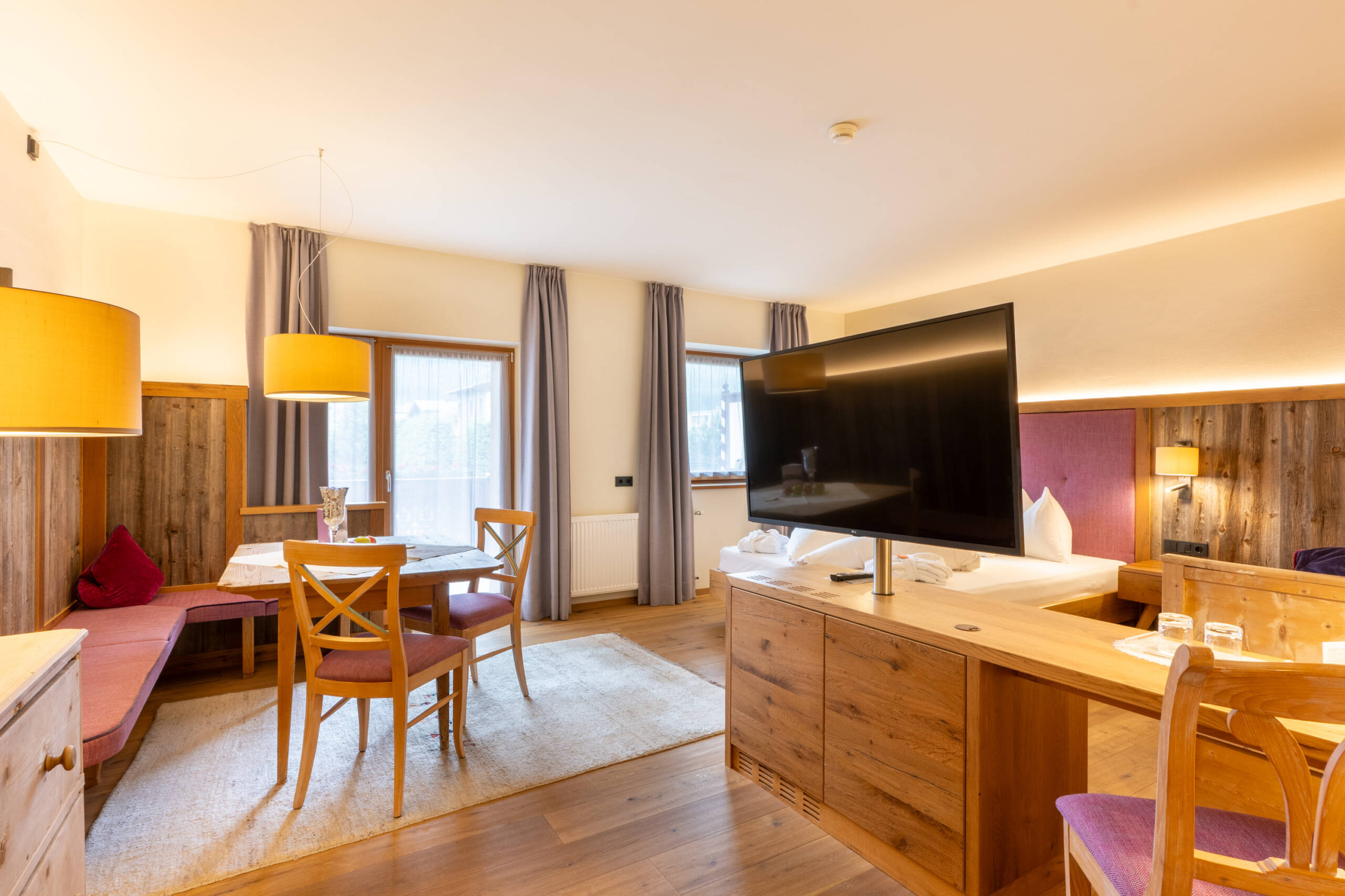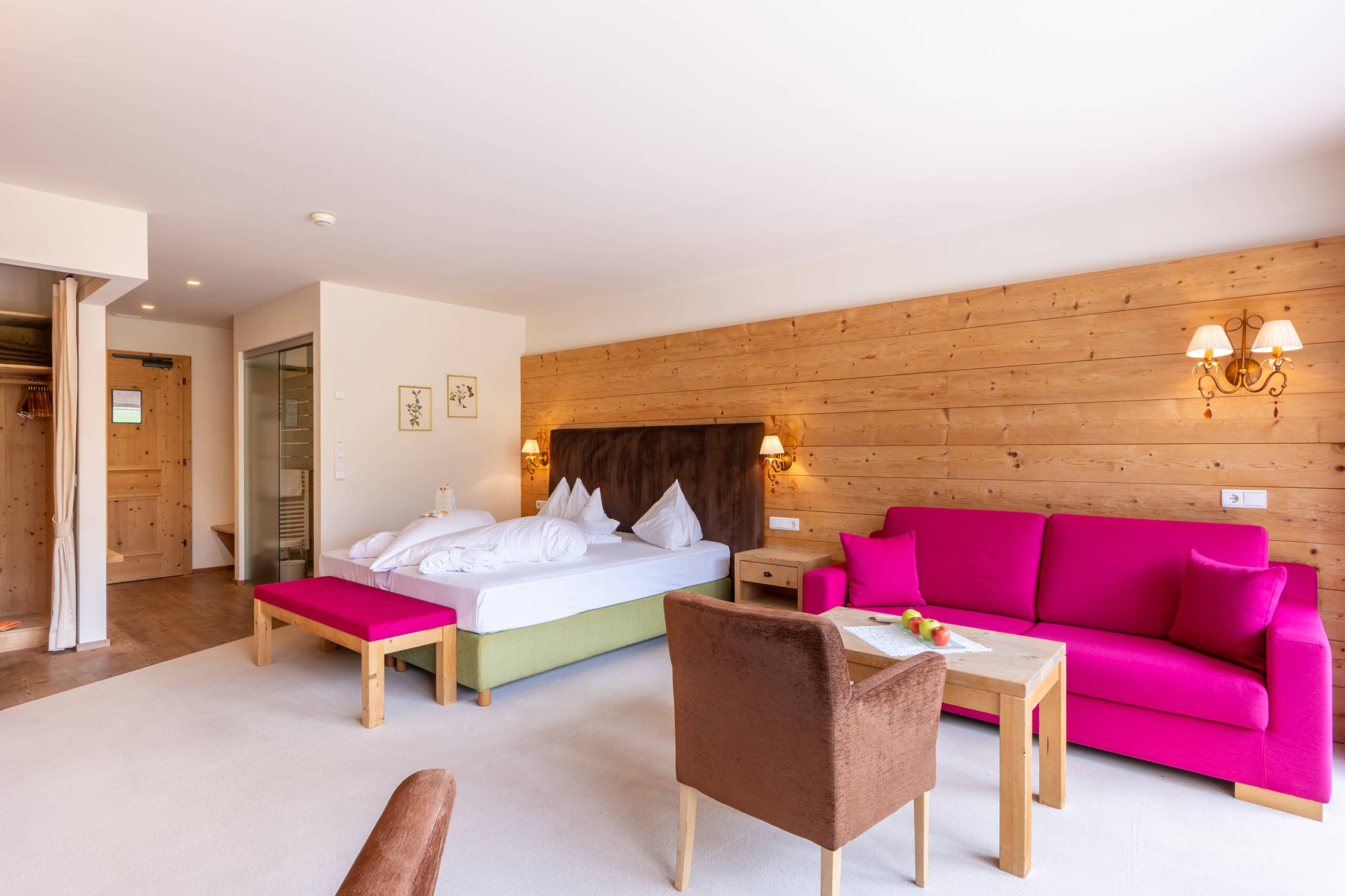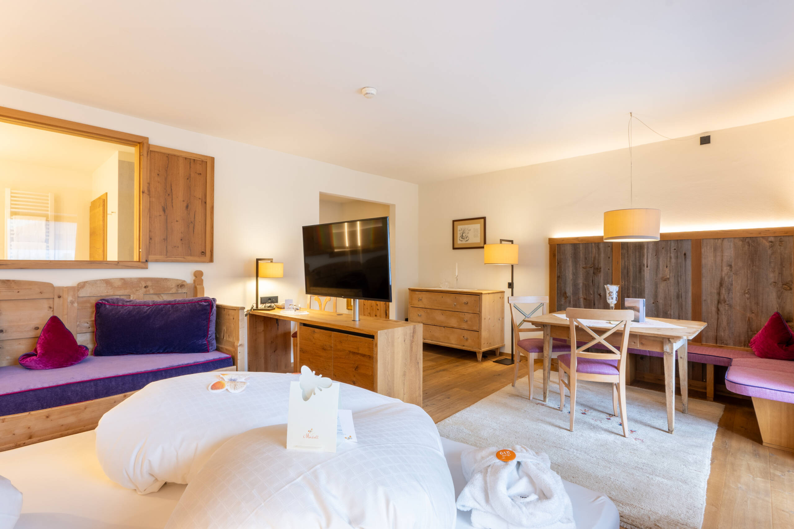 Dieses herrliche Zimmer ist in Zirbenholz eingerichtet mit violetten und gelben Stoffen, bietet ein Tageslichtbad mit Dachfenster, Badewanne und Dusche, separatem WC mit Bidet, getrenntem Wohnzimmer, 2 Sat-TV’s, Internetanschluss und Loggia zum Kronplatz.