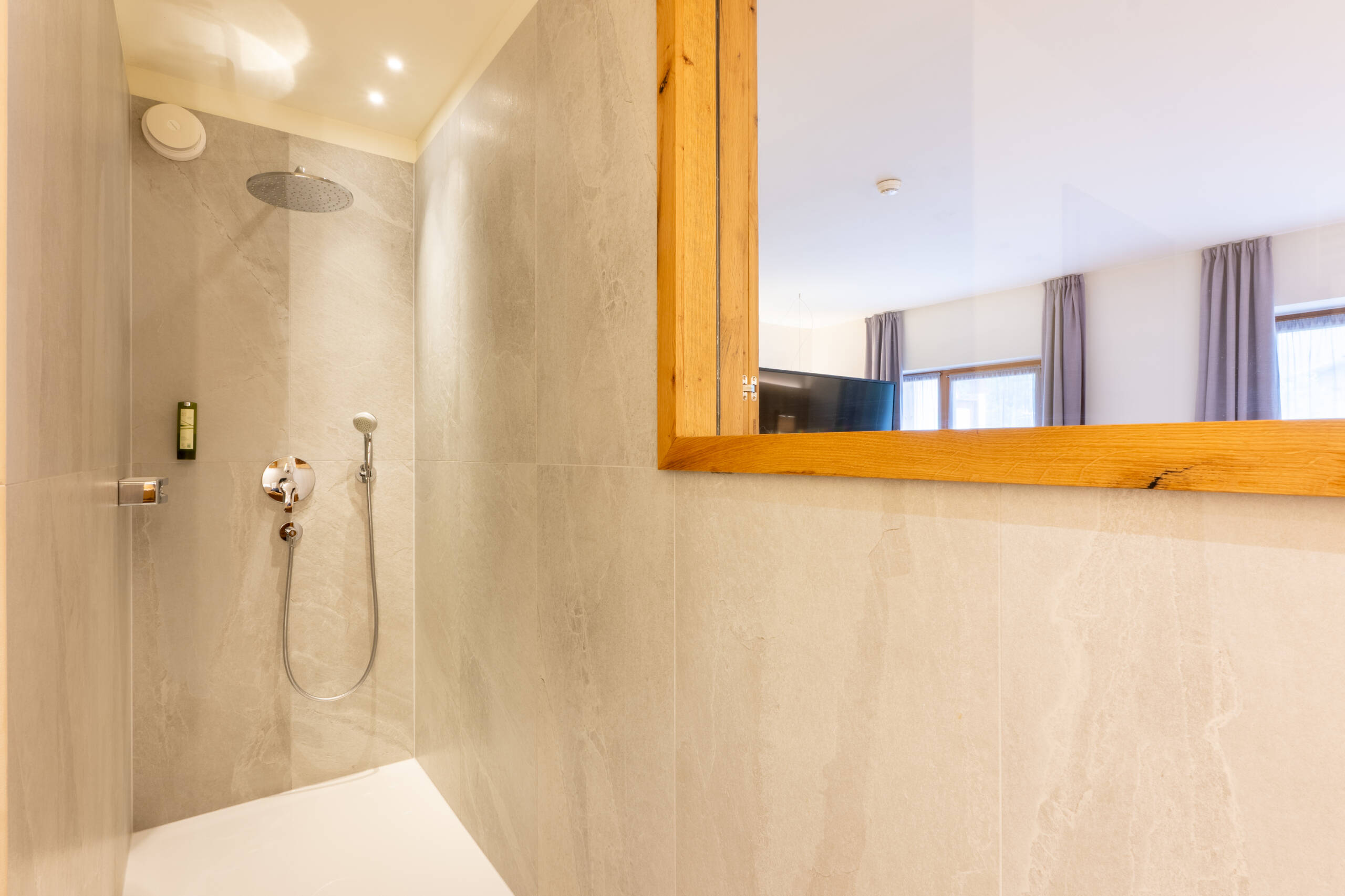 Diese geräumige Unterkunft eingerichtet in Alt-Eiche, Stadel-Altholz-Fichte und Natursteinboden, moderner Beleuchtung, besitzt ein Bad mit großer ebenerdiger Dusche, getrenntem WC mit Bidet und Waschbecken, großzügiges Entrée mit begehbarem Schrank, Schlafzimmer mit Ehebett, Wohnraumecke, Sat-Smart-FullHd-Led-TV, Internetanschluss und Südbalkon mit traumhaftem Garten- und Dolomitenblick.