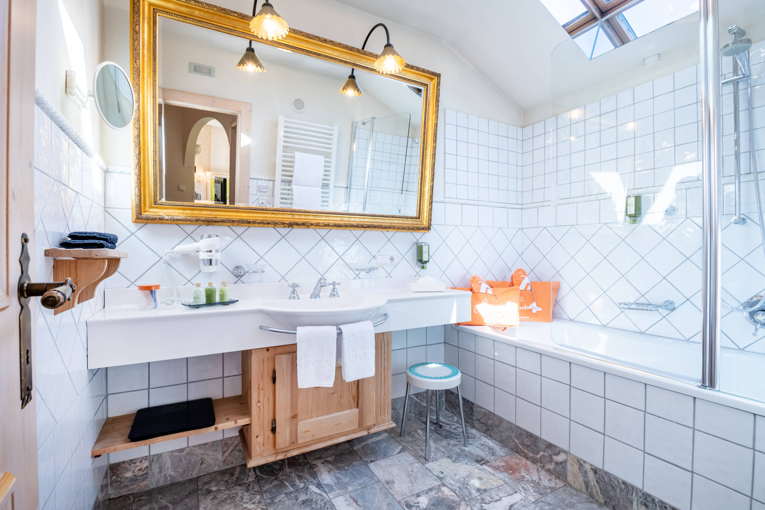 Diese geräumige Unterkunft eingerichtet mit Altholz, besitzt ein Bad mit Dusche, getrenntem WC mit Bidet, begehbarem Schrank, separatem Schlafzimmer mit Dachfenster, Wohnraum mit Schlafmöglichkeit, 2 Sat-TV’s, Internetanschluss und Südbalkon mit traumhaftem Garten- und Dolomitenblick bestückt.